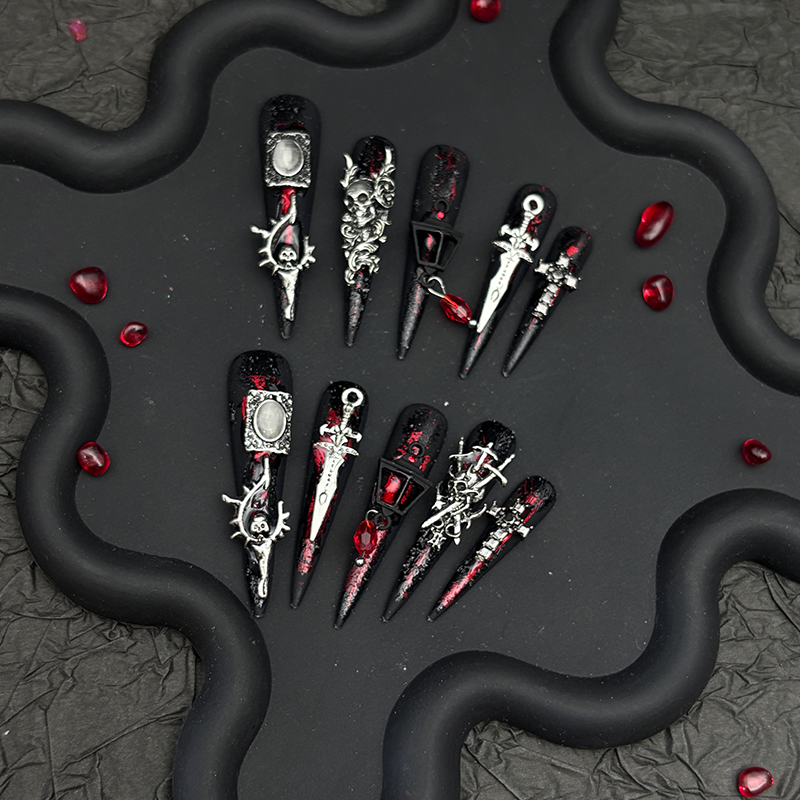 Goth Dark Stiletto Press On Nails - Handmade Devil Contract Removable Style