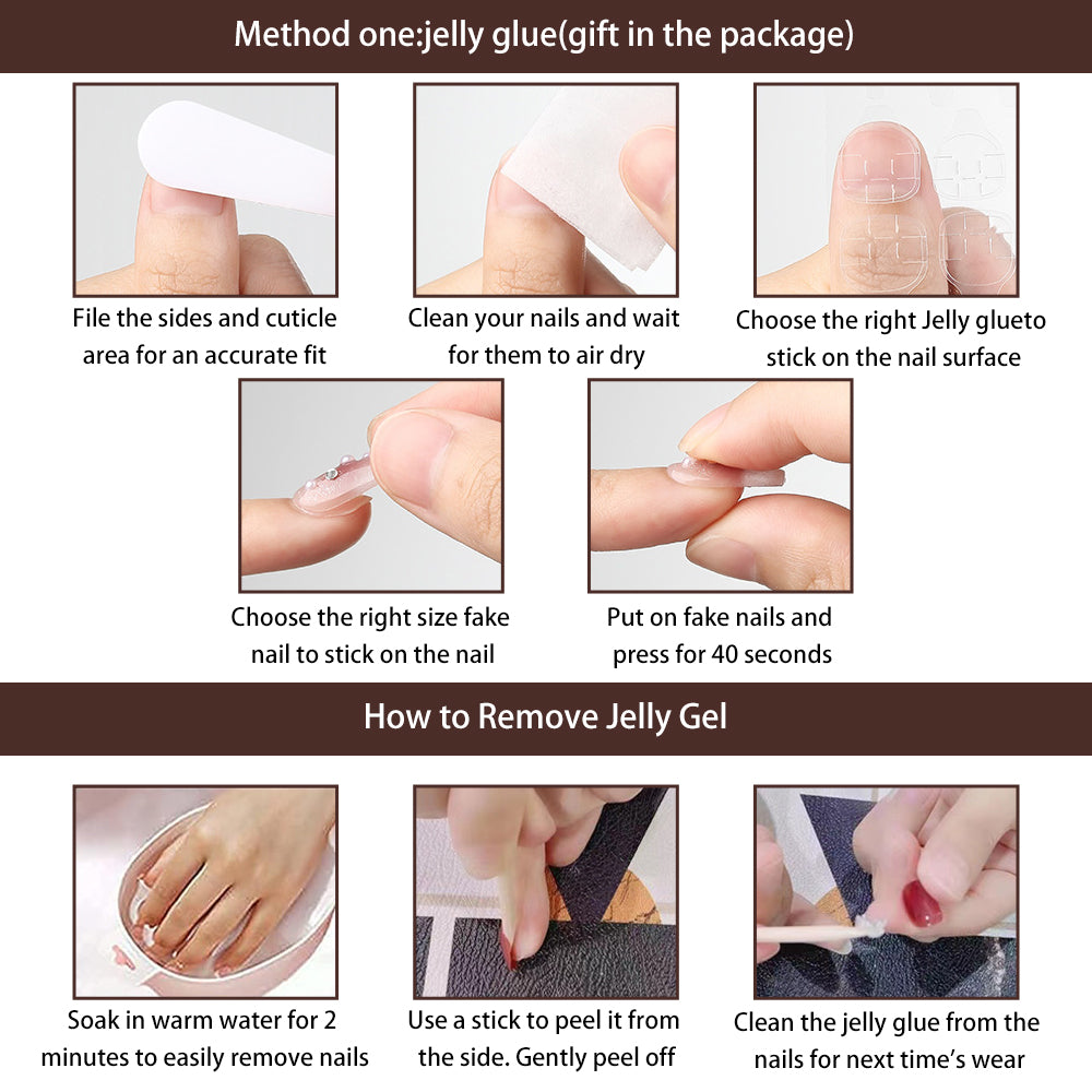 3. Convenient: Includes matching jelly glue and adhesive, offering two application methods. Quick to apply in 5 minutes with versatile styles, saving time at nail salons.